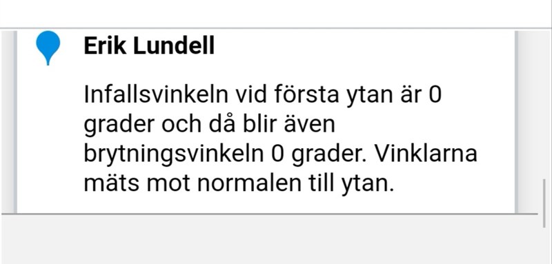Yngve skrev:R.i.Al skrev:jo jag har tänkt på det men hur kan den vara i hjälp för vinkel i?Normalen är vinkelrät mot gränsytan, det betyder att normalen bildar vinkeln 90 grader mot gränsytan.