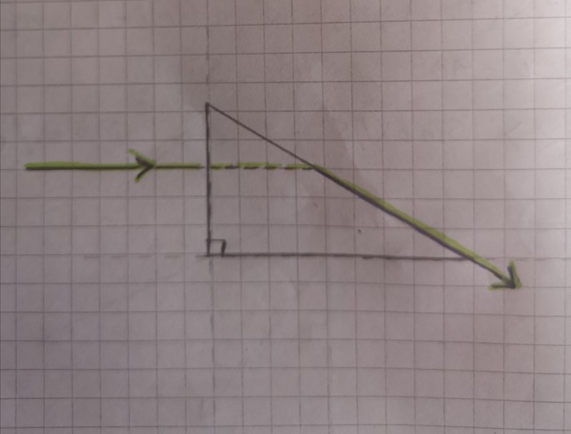 PerEri skrev:Nu börjar det se bättre ut. När ljusstrålen går från luft in i prismat så blir det precis som du ritar, dvs ingen riktningsförändring. Gör en lite mer detaljerad figur för punkten där ljusstrålen i glaset möter luft igen och rita in normalen, infallsvinkel, utfallsvinkel och reflex.