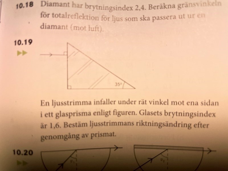 Boken är inte så tydlig med sin förklaring, jag fick ut att arcsin (1/1.6) var 38.68 grader och det borde väl vara brytningsvinkeln i prismat men sedan så tappar jag bort mig och vet inte vad jag ska göra.