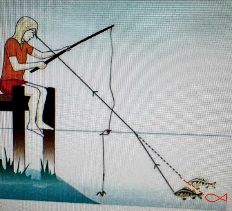 Äh, det e lugnt, jag har aldrig något emot att lära mig lite extra saker för all del! Men att fisken hamnar tidigare än vad vi tror förstår jag, det är helt logiskt. Men hur kan vi avgöra hur djupt fisken befinner sig? Varför tror vi liksom att fisken är högre upp? Låter kanske som en lite dum fråga men jag ska lägga in en bild på vad jag menar där det röda jag har ritat till är var jag tänkte att vi borde tro att fisken befinner sig.