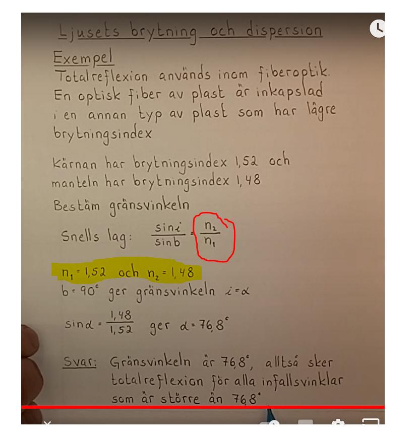 Jan Ragnar skrev:Ljushastigheten i kärnan (n=1,52) är lägre än ljushastigheten i manteln (n=1,48).
