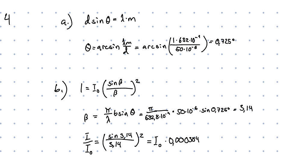 Förlåt, det du använt är förstås formeln för intensitetsminimum. Sen har du i b) räknat i grader istället för radianer - annars skulle du fått storleksordningen . Och att du inte kom ner till 0 beror på avrundningsfel.