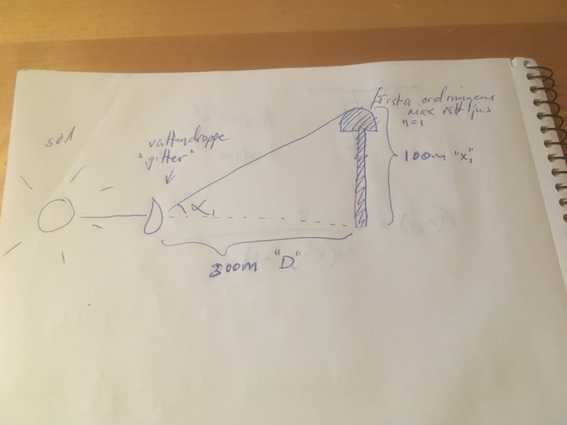 Jo, jag fattar inte heller riktigt, men jag gjorde denna figur. Jag har markerat variabelnamnen från gitterformeln som du bifogade. Rött ljus har våglängd ca 800nm. Ur figuren får man att x1= 100m (första maximum), D = 300m. Man kan då räkna fram ett värde på gitterkonstanten.