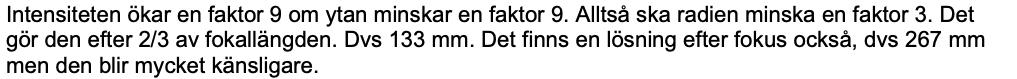 Det jag inte förstår är varför en minskning av radien med faktor 3 sker efter 2/3 av fokallängden. Man kanske ska använda sig av formeln ?