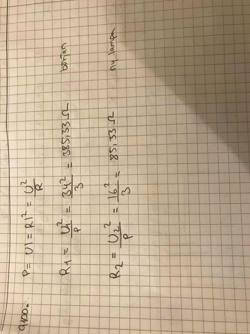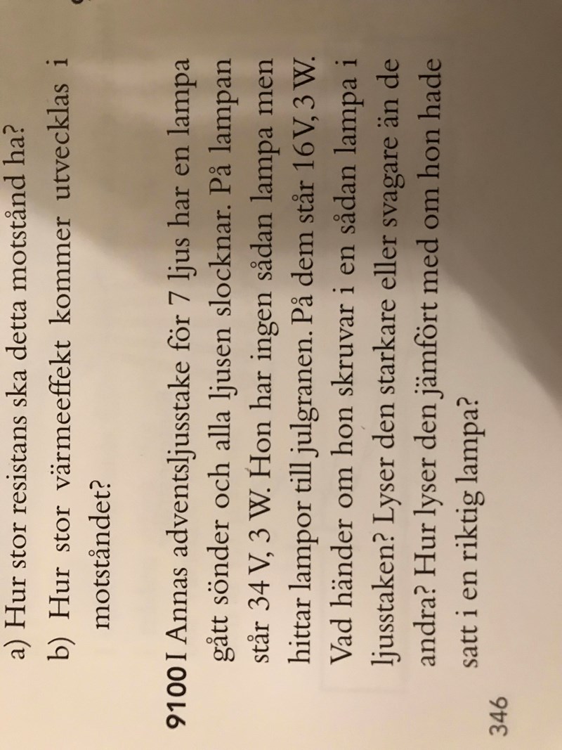 Du vet båda lampornas resistans. Lamporna sitter i serie (eller hur?), så samma ström går genom alla lamporna. Vilken lyser då starkast?
