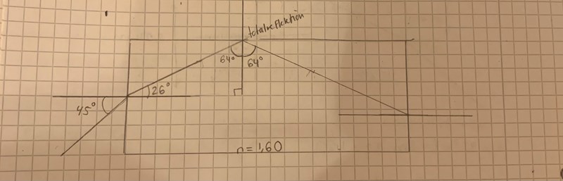 Edit: Såhär hopps jag det ska se ut. Jag vet egentligen inte om det ska ske totalreflektion men ljuset bryts iallafall ej eftersom sin a blev för stor. Om detta är korrekt så vet jag inte hur jag ska få fram okända infallsvinkeln