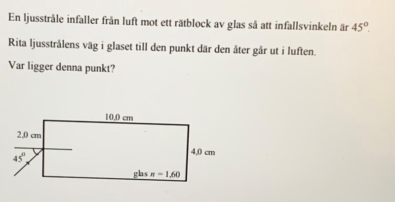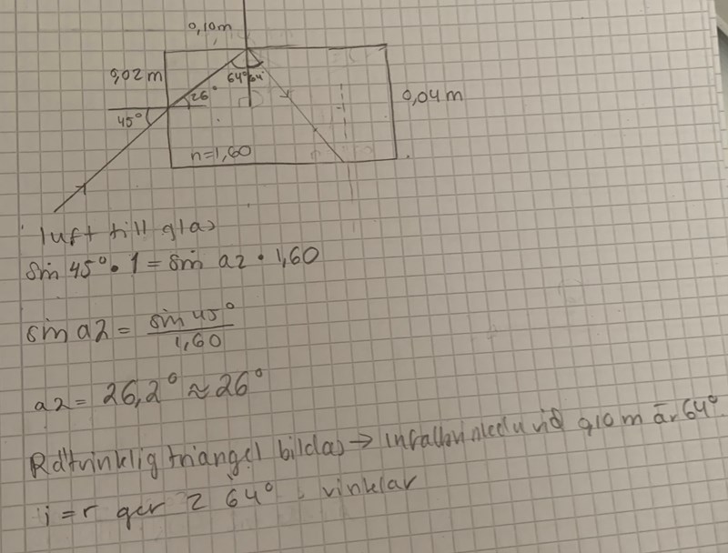 Den fortsätter ned mot normalen och sen reflekteras den upp ut ur glaset. Hur får jag fram okända infallsvinkel ?jag täntke att det bildas en rätvinklig triangel där vid den okända infallande vinkeln men vet ej hur jag ska fortsätta