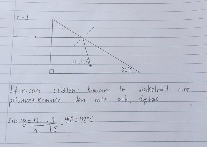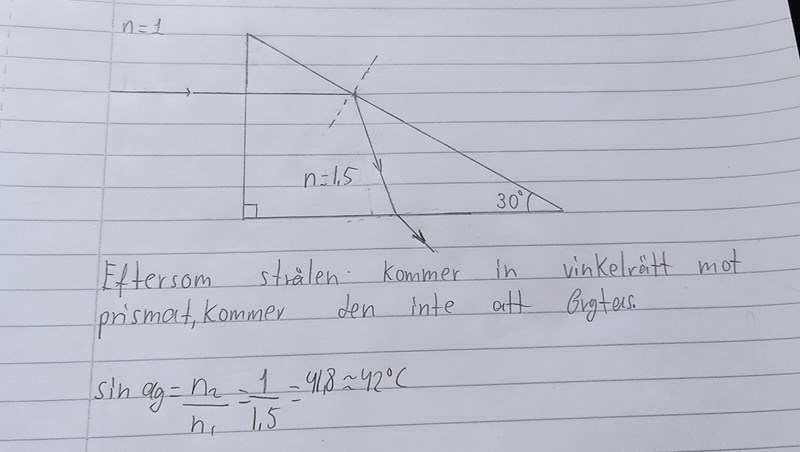 Laguna skrev:I vilken vinkel träffar strålen prismats yta innan den går ut?