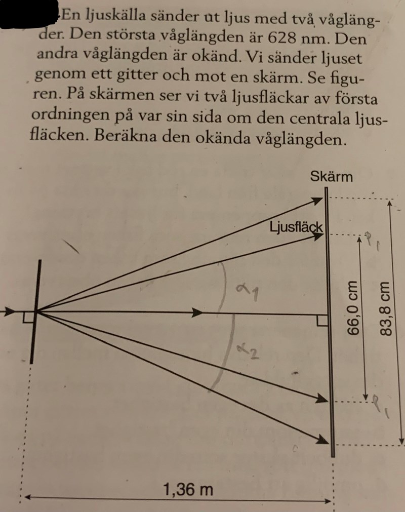 Det är kanske inte helt tydligt vad som menas, men med bilden till hjälp så är 2 av ljusfläckarna första ordningens max för 628 mm (en på var sida). 2 av ljusfläckarna (en på var sida) är första ordningens max för den okända våglängden.