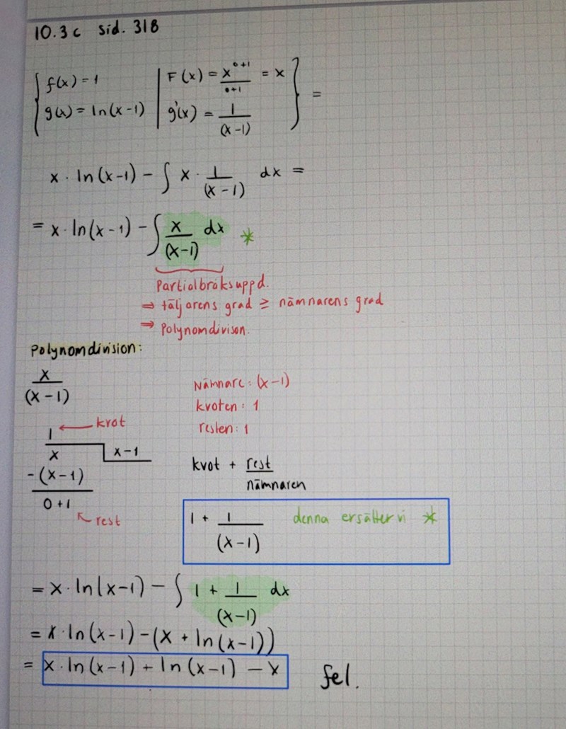 varför har du integrerat 1 och deriverat ln(1-x) under integralen? Kika på hur formeln för PI ser ut igen.