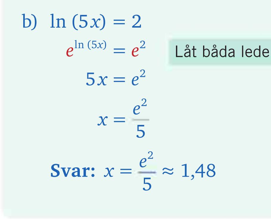 ln (5x) = 2. Behövs förklaring varför 2:an i lösning blir e²