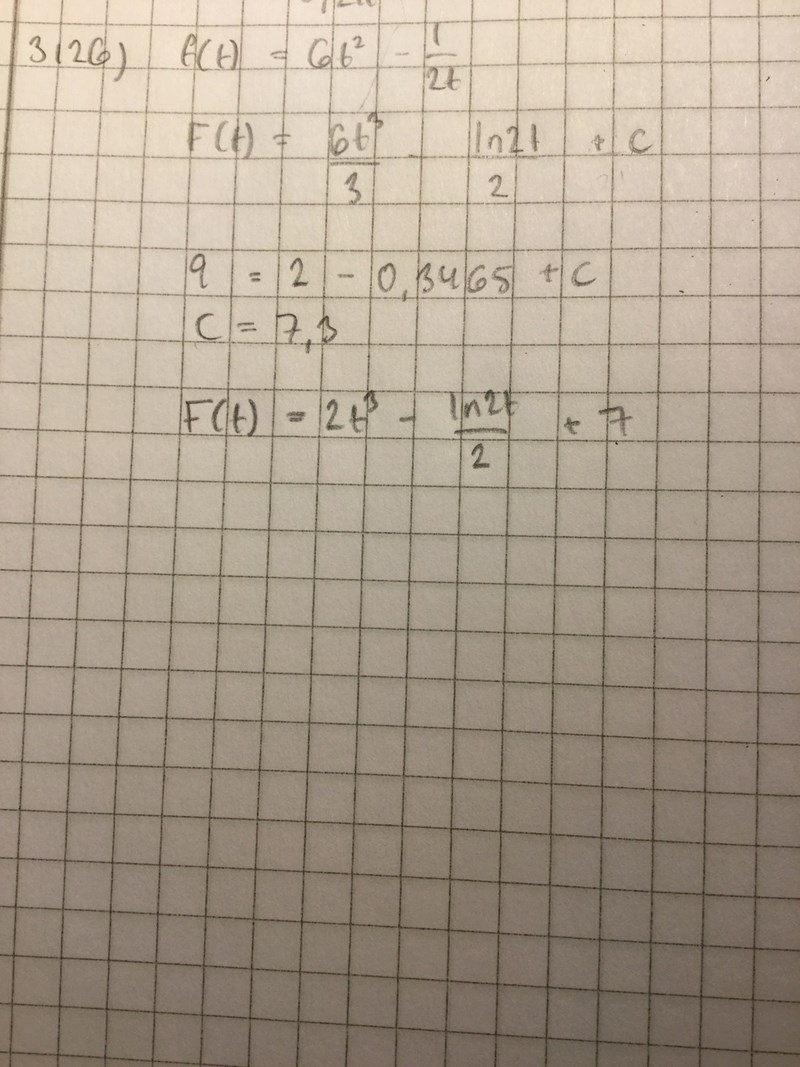Stämmer min primitiva funktion? Facit har skrivit lnt istället för ln2t men våra svar blir lika om vi deriverar