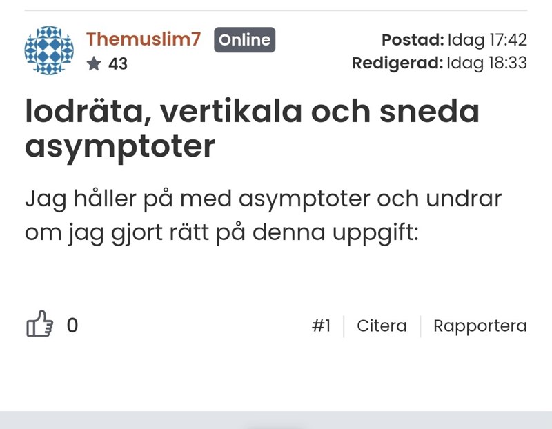 Jag håller på med asymptoter och undrar om jag gjort rätt på denna uppgift: