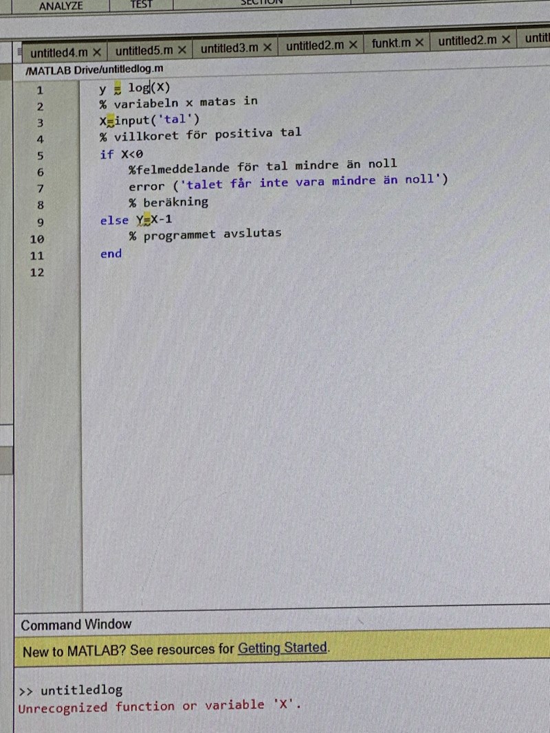 Skriv ett script där ett tal läggs in i en funktion 𝑦 = lg𝑥 och resultatet anges. Tänk på logaritmfunktionens definitionsmängd.