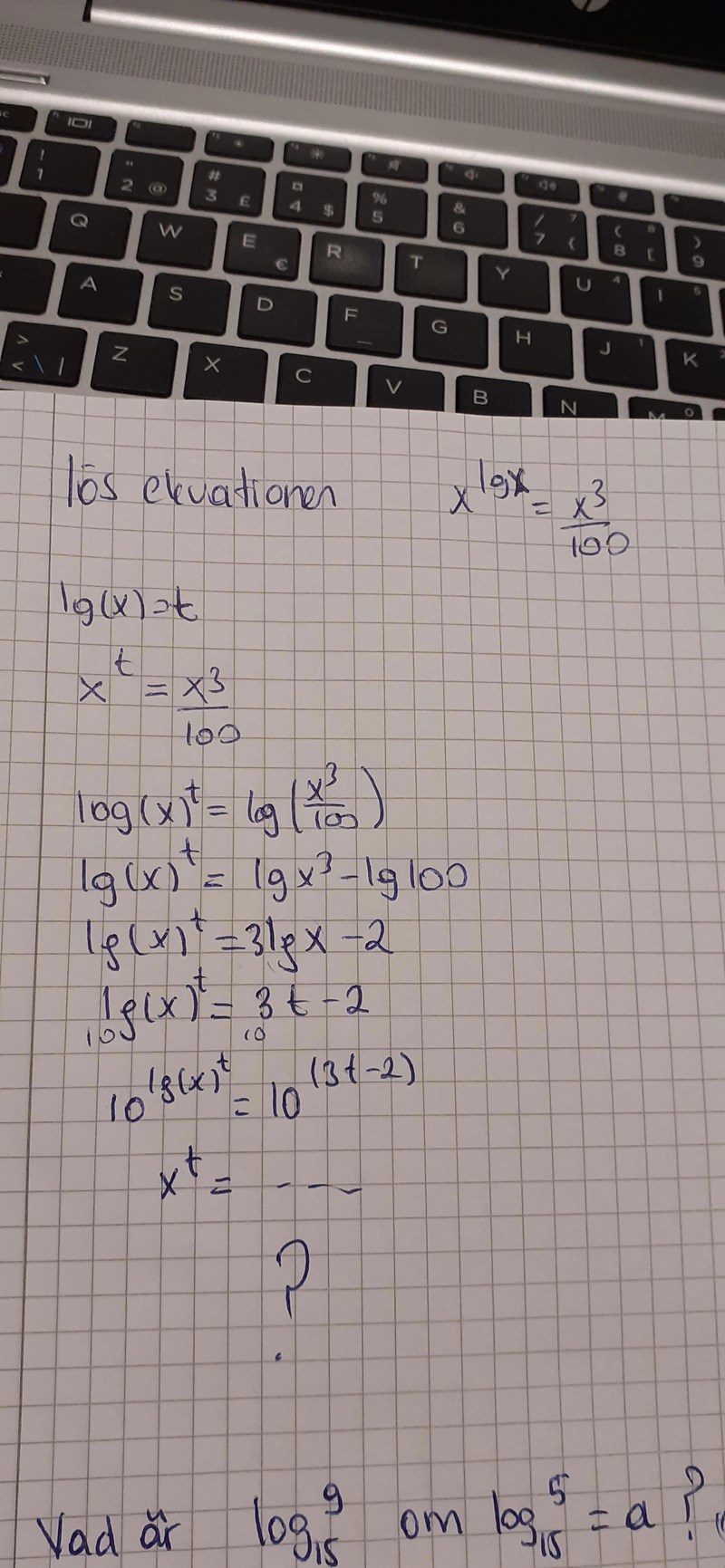 Du måste ta logaritmen av *hela* vänsterledet när du logaritmerar. Den rödmarkerade borde därför vara :