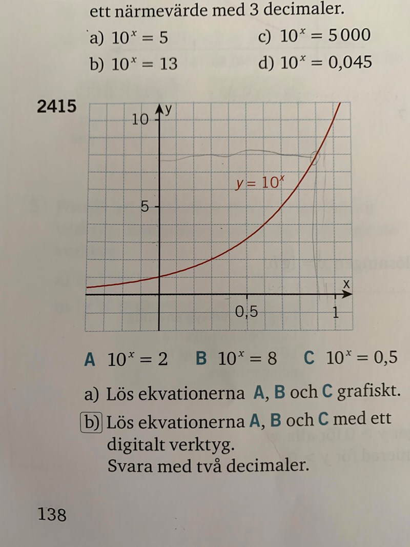 Hej! Vi gick igenom logaritmer idag och har fastnat på uppgift 2415 a). När jag ska lösa C 10^x = 0,5 grafiskt får jag det till ung 0,3 inte till -0,3 som facit skrivit. Vad har jag gjort för fel?