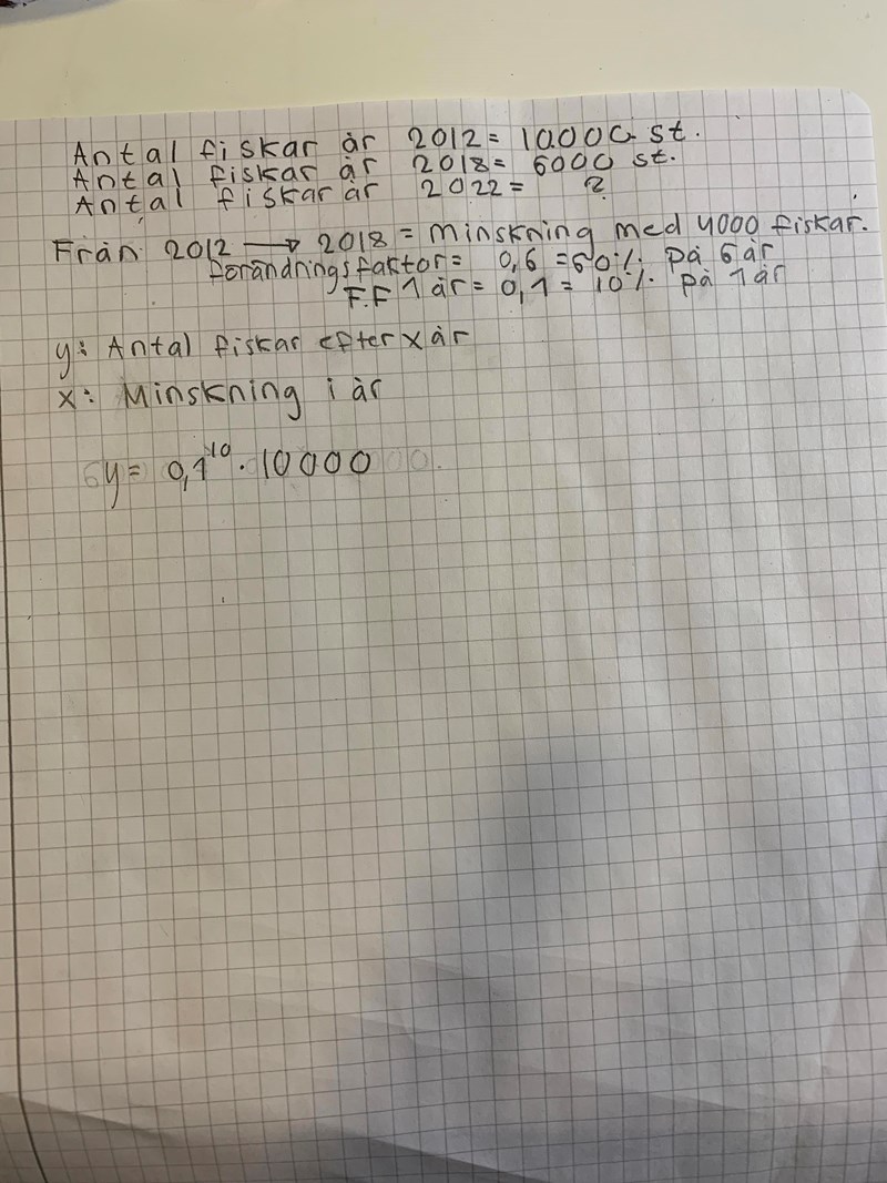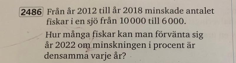 Student02 skrev:Smutstvätt skrev:Du har inte tagit fram förändringsfaktorn korrekt, eftersom minskningen är inte linjär. Det stämmer att FF är 0,6 över de sex år som gått, men upprepad förändringsfaktor kommer att verka "på varandra" också. Du får alltså . Vad blir då den årliga förändringen, x?