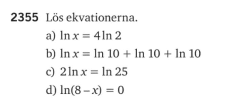 Jag har försökt och får svaret till x=8 men det ska bli 7. Hur löser man denna uppgift. Jag försökte ta ln 8 - ln x = 0 och sedan bara flytta över ln x till andra sidan och ta bort ln men det blev fel.