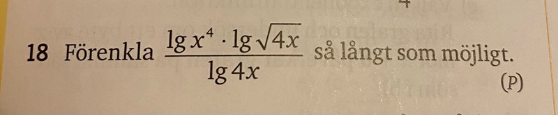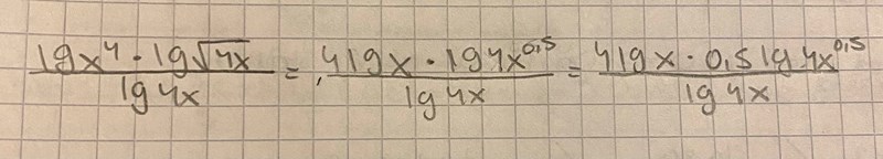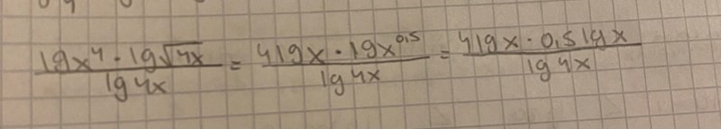 Bra, ser du att det finns samma faktor i nämnaren som i täljaren? Bort med dem. Sen kan du ju ta och multiplicera 4lgx med 0,5 också sen är du klar