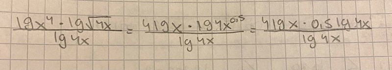 Är det 4an du menar som försvinner från nämnaren och täljaren (4x)? Eller menar du att hela lg 4x försvinner från nämnaren och täljaren så att det bara är 4lgx•0,5 kvar?