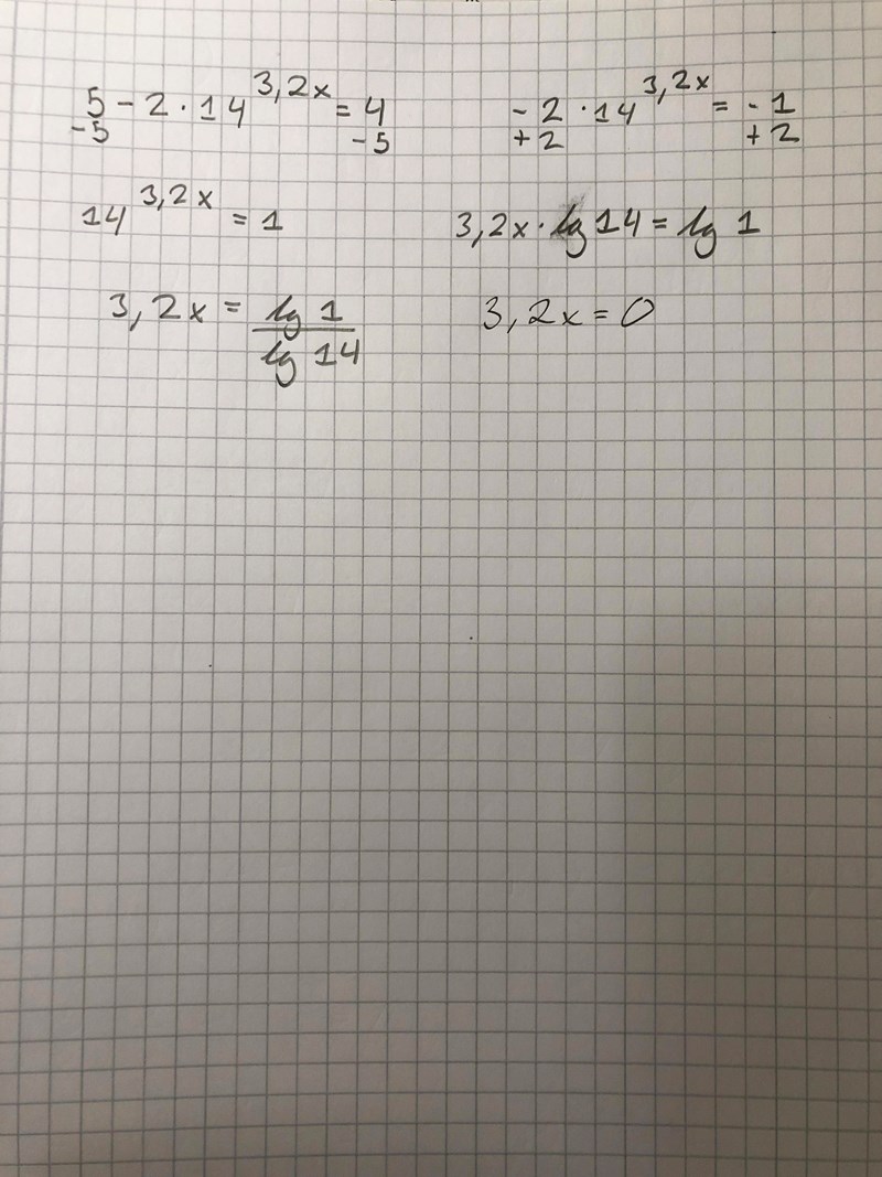 Först adderar du med -5 på båda sidor (eller subtraherar med 5, det går på ett ut) men vad är det du gör sedan? Du har att -2·143,2x=-1-2\cdot14^{3,2x}=-1. Vilket räknesätt är motsatsen till "gånger minus två"?