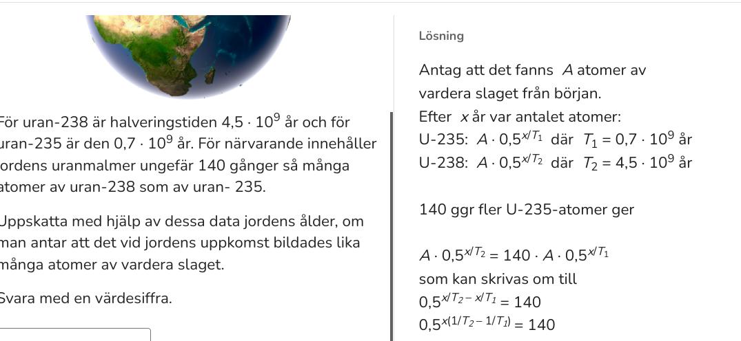 Yngve skrev:Variabeln x anger inte halveringstiden utan istället antalet år som har gått sedan jorden bildades.