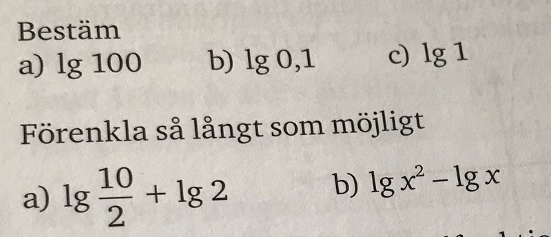 abcdefghijklmo skrev:Okej, men hur gör jag på den andra uppgiften. Löste den som lg5 + lg 2 vilket är lg10. Är det korrekt?
