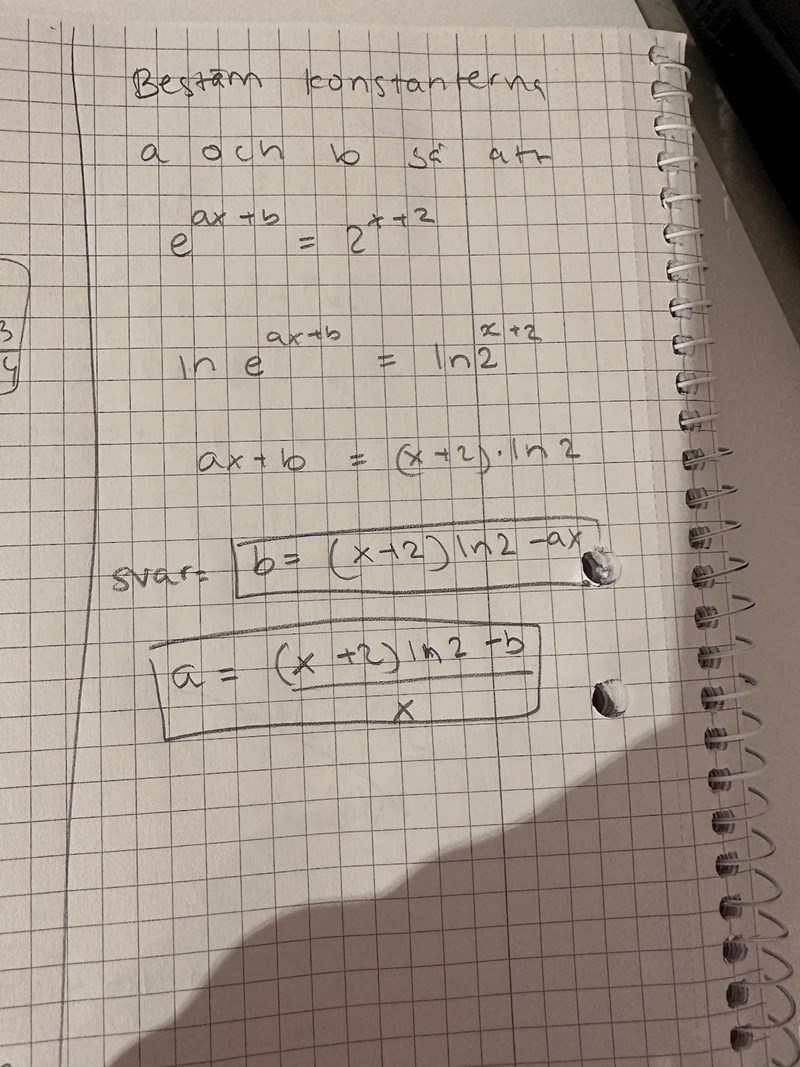 Du kan förenkla b genom att skriva det som ln(2) + ln(2) och använda dig av en logaritmlag.