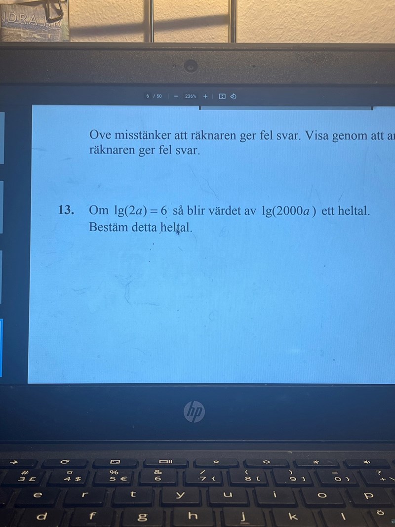 Hej, du får använda dig av en logaritmlag i den här uppgiften. Man har att lg(2000a)=lg(2a*1000)=lg(2a) + lg(1000)=6+3=9.