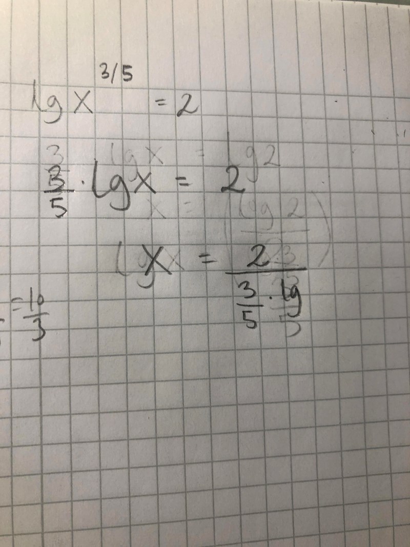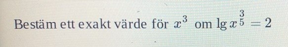 Nästa steg kan vara att multiplicera båda sidor med 5 och sedan använda samma logaritmlag en gång till, fast "baklänges".