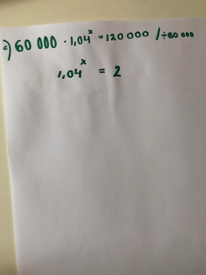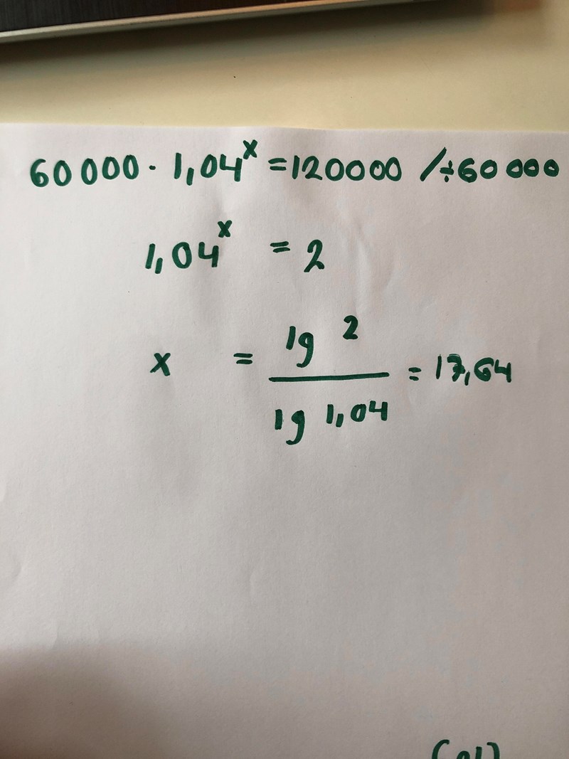 Och sedan delar man båda leden med lg(1.04) för att lösa ut x.