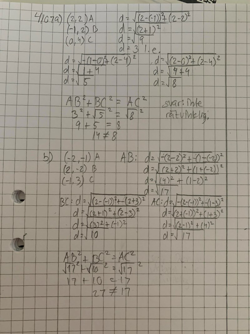 I varje fall har jag nu räknat ut b)-uppgiften för hand på samma sätt som du och kommit fram till att det är en rätvinklig triangel. Det som blir annorlunda är vid uträknandet av BC: