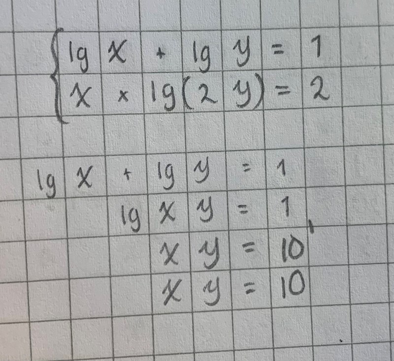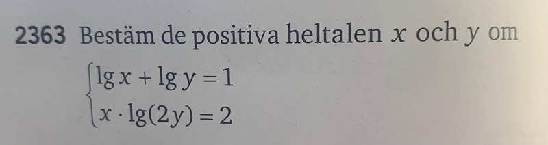 Alltså jag har försökt skriva om den första ekvationen med hjälp av logaritmlagarna. Men vad ska jag göra nu? Kan jag "stoppa in" xy=10 på något sätt i den andra ekvationen, eller hur ska jag göra?