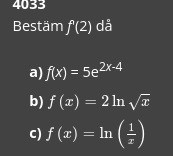 Efter du har deriverat får det jag skrev ovan, då kan du bara placera 2 istället för x i funktionen.