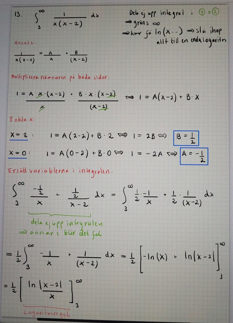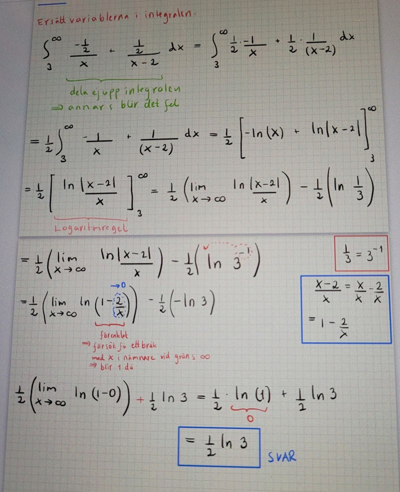 (1/2)*ln[(x–2)/x] från x = 2 till oändl. (Absoluttecknet behövs inte eftersom 3 > 2)