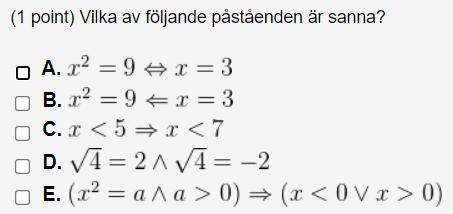 A: falskt - ( Tecknet implicerar att båda sidorna gäller för varandra, men x i måste som sagt inte vara 3 utan kan vara -3.