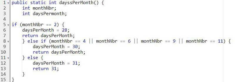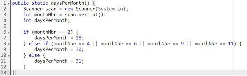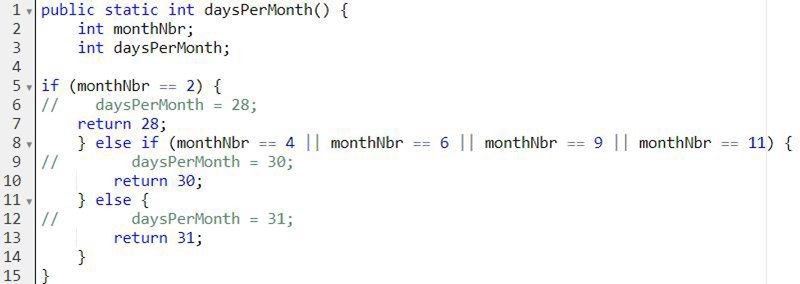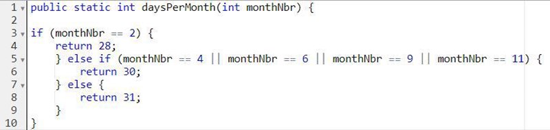 Skriv en metod vid namn daysPerMonth med en parameter monthNbr av typen int. Denna metod ska returnera antal dagar i månad nummer monthNbr. Månaderna numreras 1-12 (skottår försummas).
