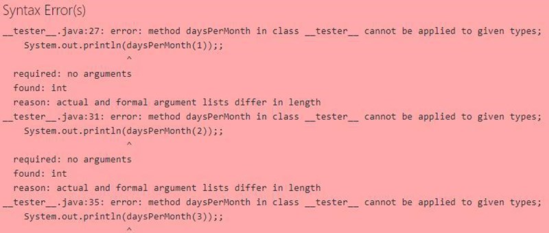 Ett annat problem (som antagligen inte kompilatorn fångar) är att du i metoden daysPerMonth använder variabeln monthNbr utan att ha satt den.