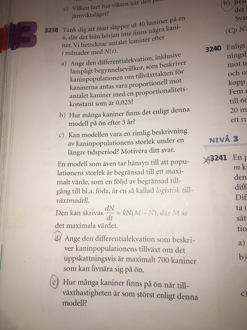 Förstår ej uppgift d och e och varför svaret i uppgift d är dn/dt = kN( 1- N/700)
