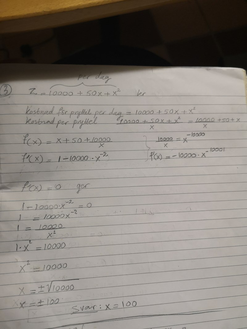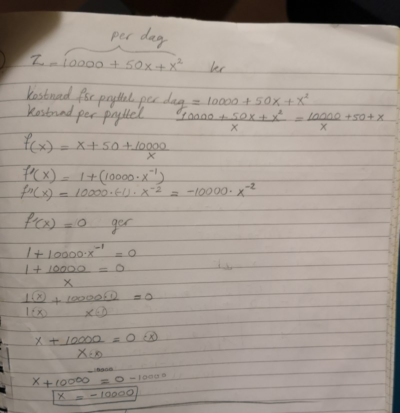 knegarn1 skrev:Till och med raden där du skrivit f(x) har du gjort rätt. Du har dock deriverat felaktigt. f'(x) = 1-10 000x^-2. För att lösa uppgiften behöver du inte ta fram andraderivatan. Nu kommer du få ett positivt värde!