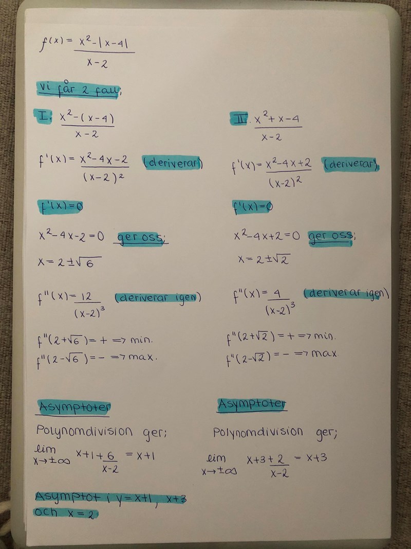 lund skrev:Hondel skrev:Angående de sneda asymptoterna: Du har delat upp funktionen i olika fall. När gäller dessa fall (för vilka x)? Vilket fall gäller när x närmar sig + oändligheten? När x närmar sig - oändligheten? Du har x låtit gå mot +/- oändligheten i båda gränsvärden, men de är bara ett alternativ per fall som är intressant.