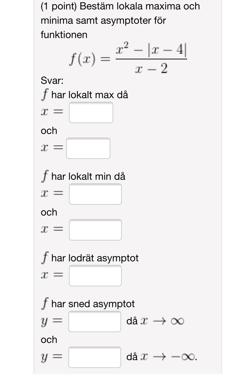 Jag trodde att jag vid detta laget förstått mig på max-och minpunkter samt asymptoter men icke. Jag har försökt att lösa följande fråga: