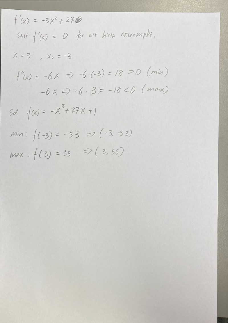 Marcus N skrev:Om vi ta uppgiftens graf som exempel. f(x) = -x^3 +27x +1 lokalt maxivärde till den är (3, 55) och lokalt minvärde är (-3, -53).