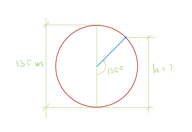 Om höjden ovanför origo är 67.5m, kommer du alltså befinna dig (67.5*sin45) = 47.7m ovanför origo. Detta är som att säga att du befinner sig ungefär 20m under hjulets topp vilket är totalt 135m.
