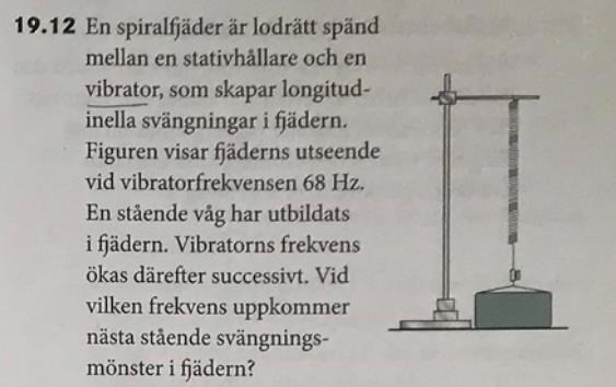Lite problem med denna uppgift, frekvensen är 68 Hz, det ser ut att vara 5 noder på fjädern så det måste vara den 3:de övertonen(gäller detta även för longitudinella vågor eller bara transversella?). Längden på vågen är då . Sen är frågan vilken frekvens uppkommer nästa stående svängningsmönster i fjädern, jag antar att detta betyder när vi får en till nod? iså fall blir längden på vågen 5/2λ, jag vet dock inte hur mycket frekvensen ökar när vi får en extra nod, jag har lekt lite med v=fλ, hastigheten kommer vara densamma men kommer ändå inte fram till något vettigt. Finns det något samband jag ska använda mig av?