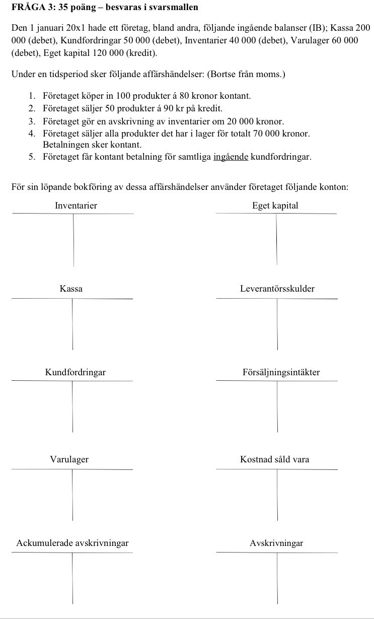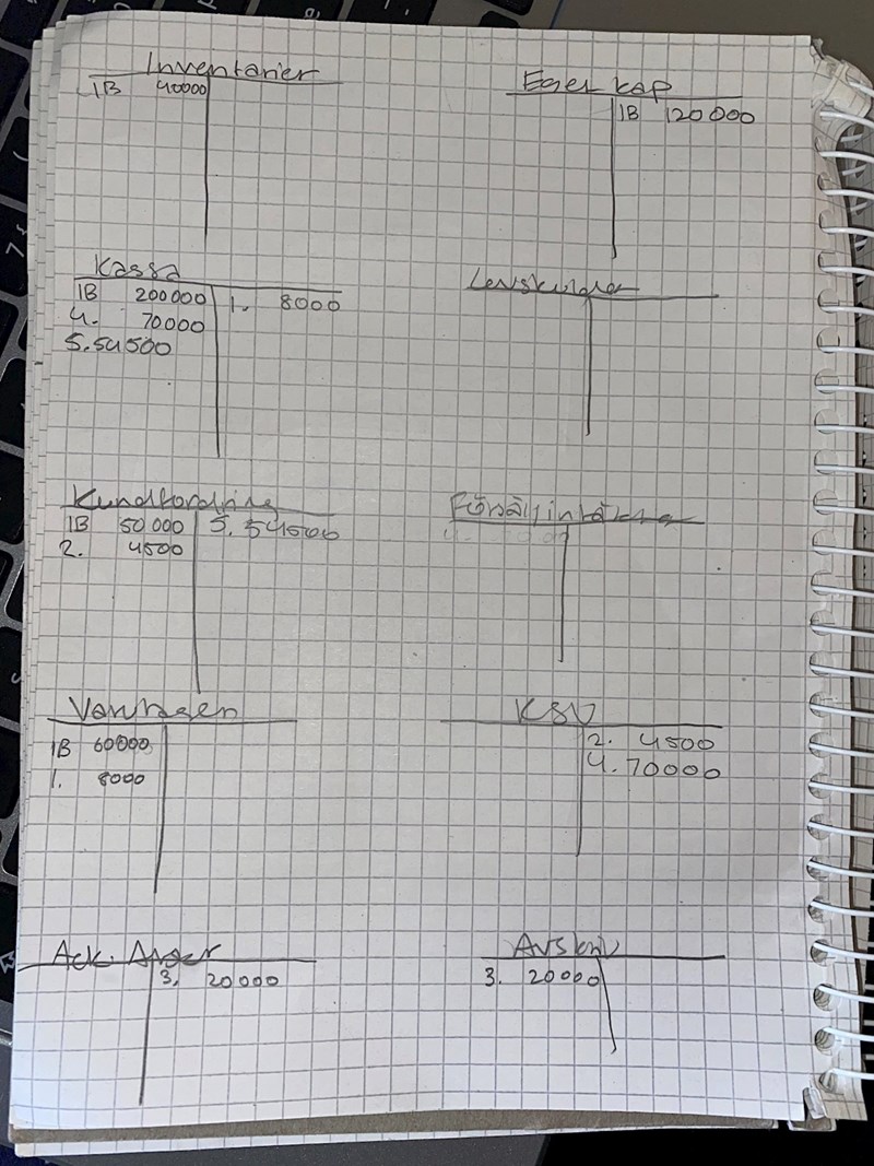 1. lagt in 8 på varulagrets debetsida och krediterat 8 på kassa kontot.