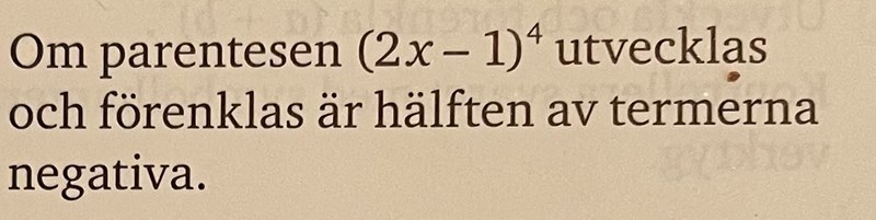 Med a = 2x och b = -1 får vi (2x-1)4 = (2x)4+4•(2x)3•(-1)+6•(2x)2•(-1)2+4•(2x)•(-1)3+(-1)4 = 16x4-32x3+24x2-8x+1