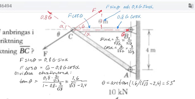 1: varför sätter man lika med -f*sin(0) där jag jag markerade med den röda färgen vilket även gäller samma - f*cos(0), Kan det bero på att krafterna y-led och x-led tar ut varandra att det därför man sätter lika med Noll samt varför har dem en kraft där jag markerar med den röda färgen vad står kraft (F) för de skriver inte om kraften är bc eller ac?