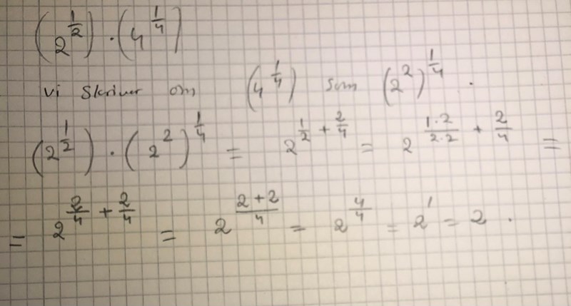 1. 2^1/2 x 4^1/4 skrivs om i potensform med basen 2. 2^1/2 x 2^1/2 då jag ska beräkna produkten, dvs 2.