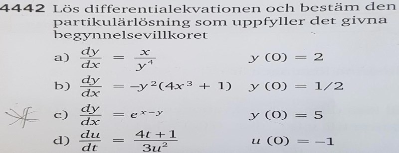 dydx=ex-ydydx=ex·e-y1e-y·dydx=exey=exey=ex+Cln ey=ln( ex+C)y=x+D            där D=ln Cy(0)=55=Dy=x+5